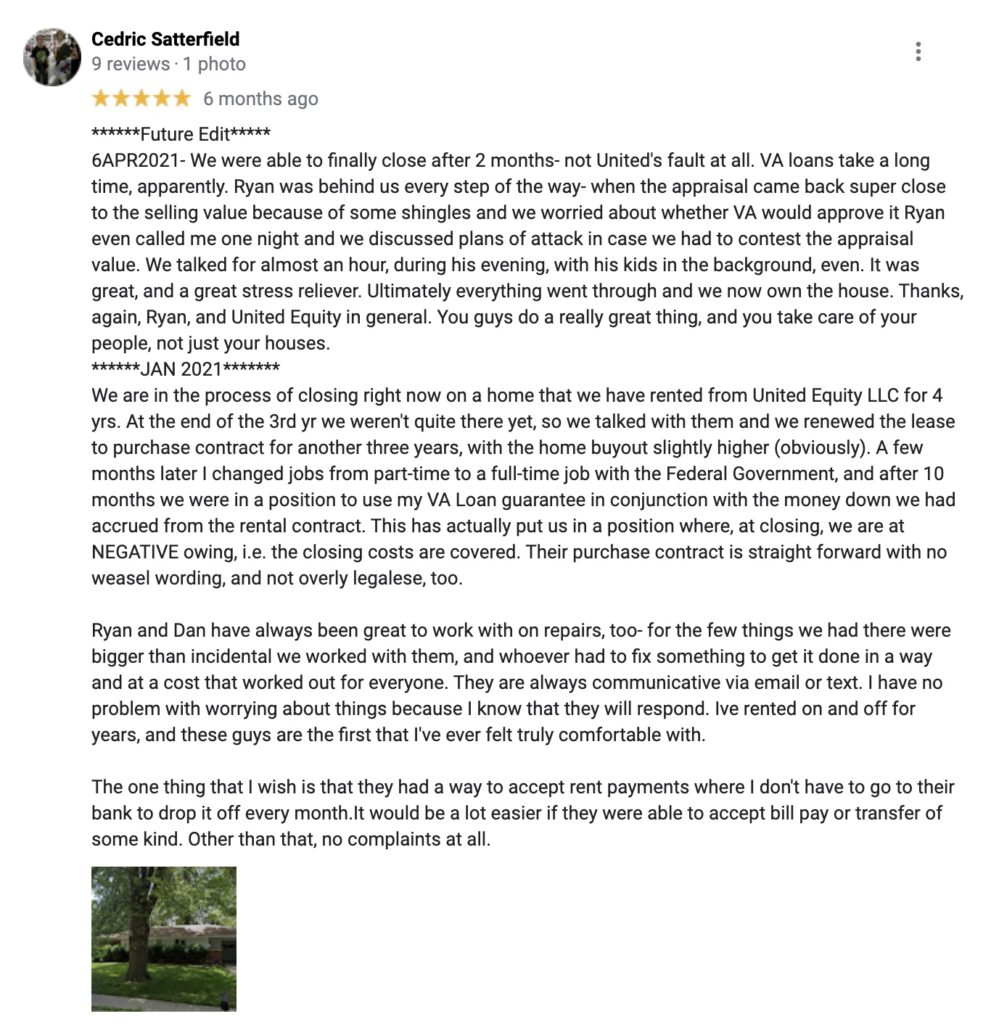 “Kay and I still can’t get over how easy Ryan and United Equity made this transaction. We will recommend your company to any future seller. On a scale of 1 to 10, you are a 15.”